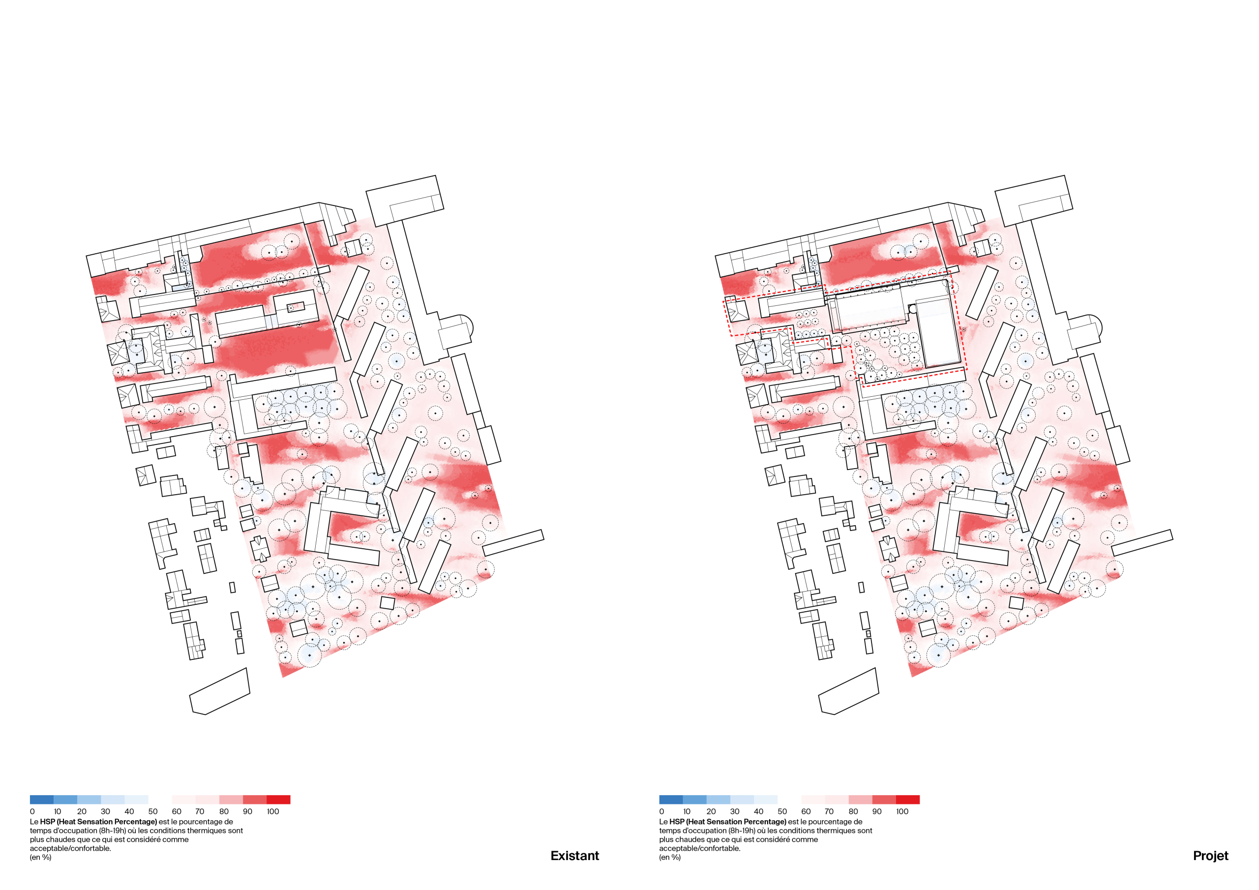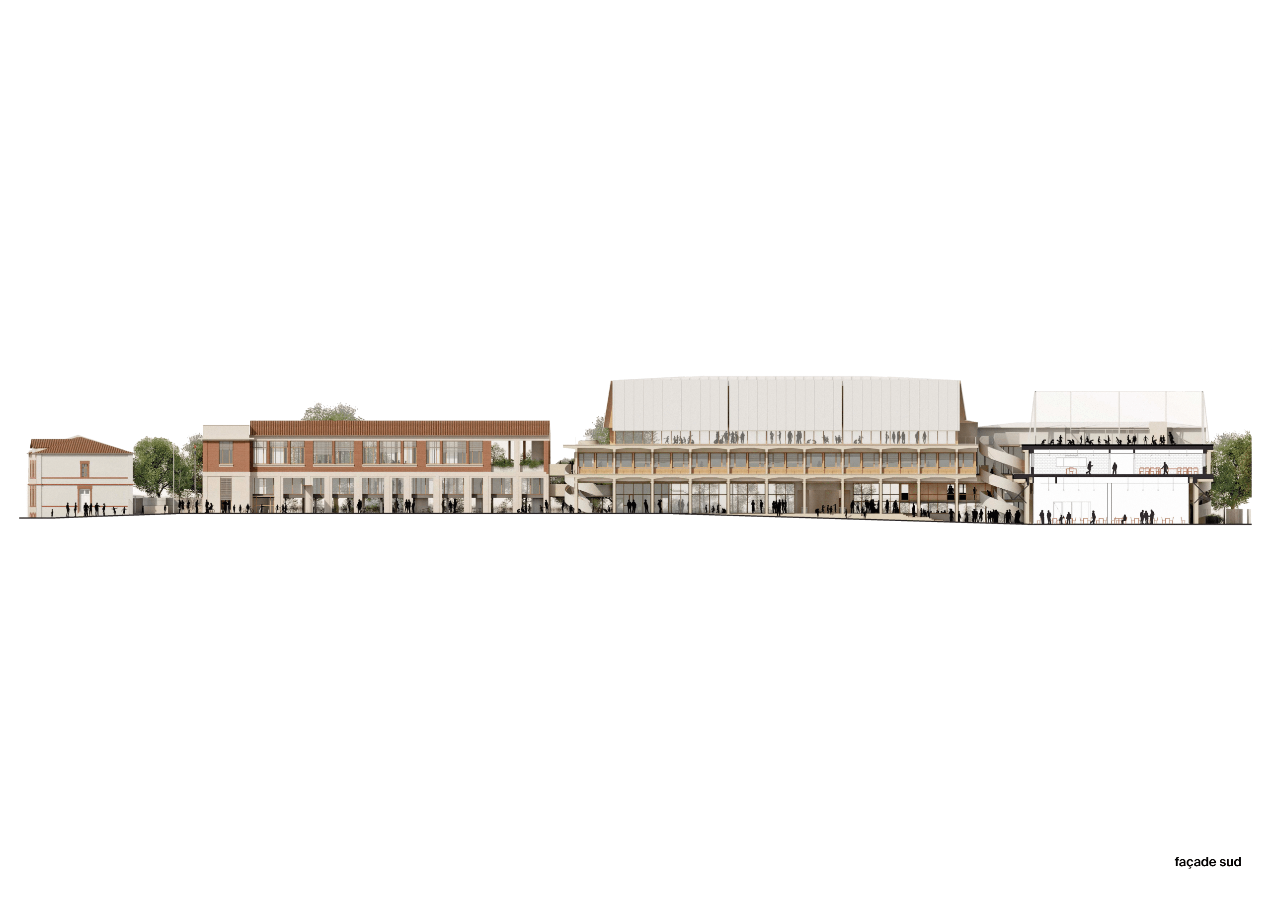 Le projet prend soin d’articuler les volumes du futur projet aux figures urbaines constituées dans ce quartier. La réhabilitation du bâti existant et la construction de volumes réduits pour les bâtiments nouveaux permet de dégager des espaces libres de qualité dans le prolongement visuel des espaces libres existants. Le gabarit « contenu » des nouvelles constructions réduit l’échelle perçue des masses bâties.