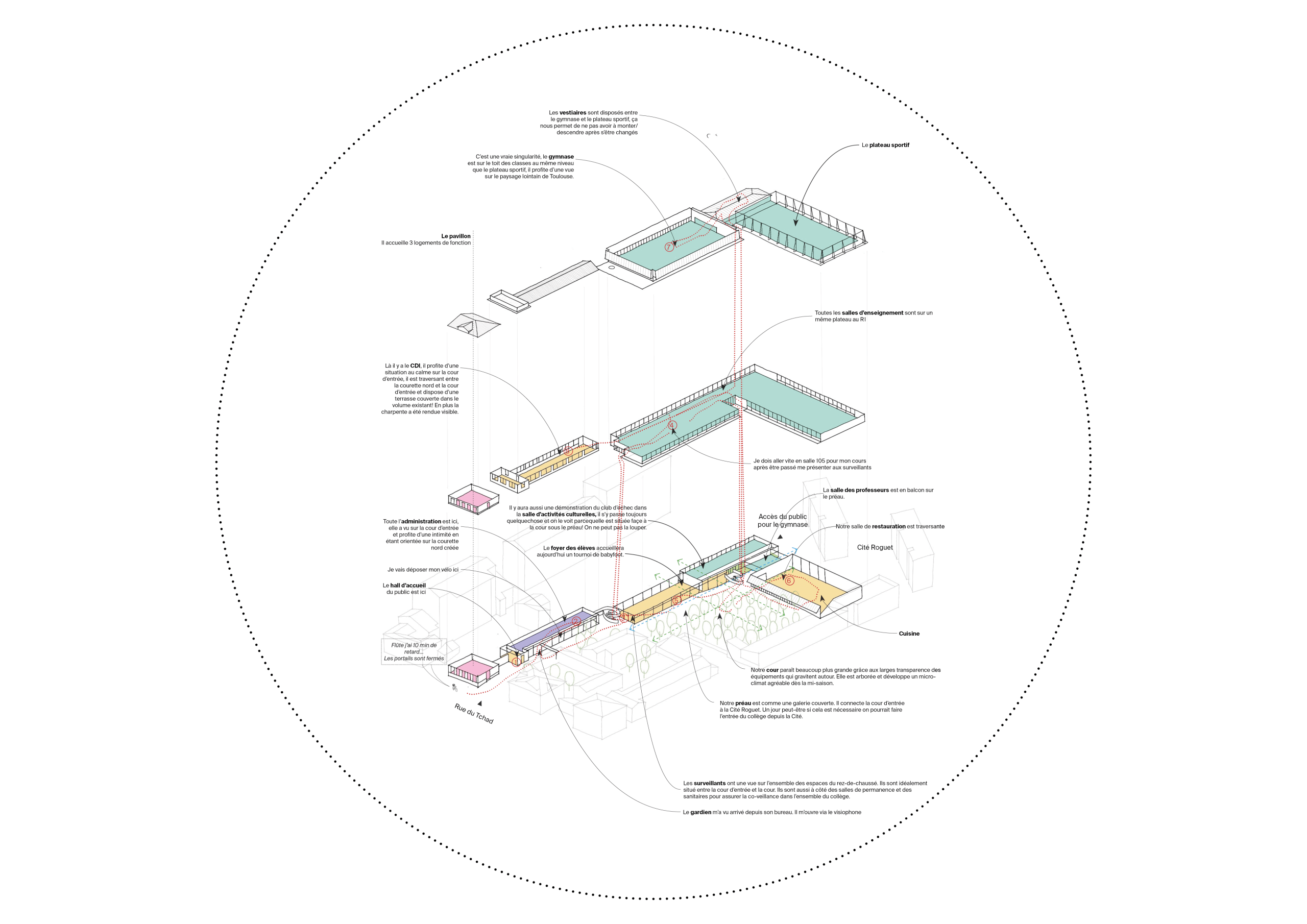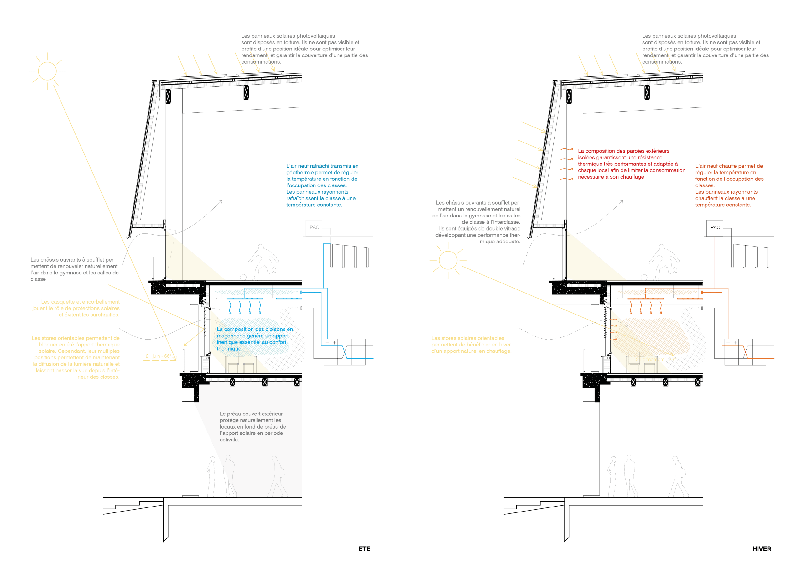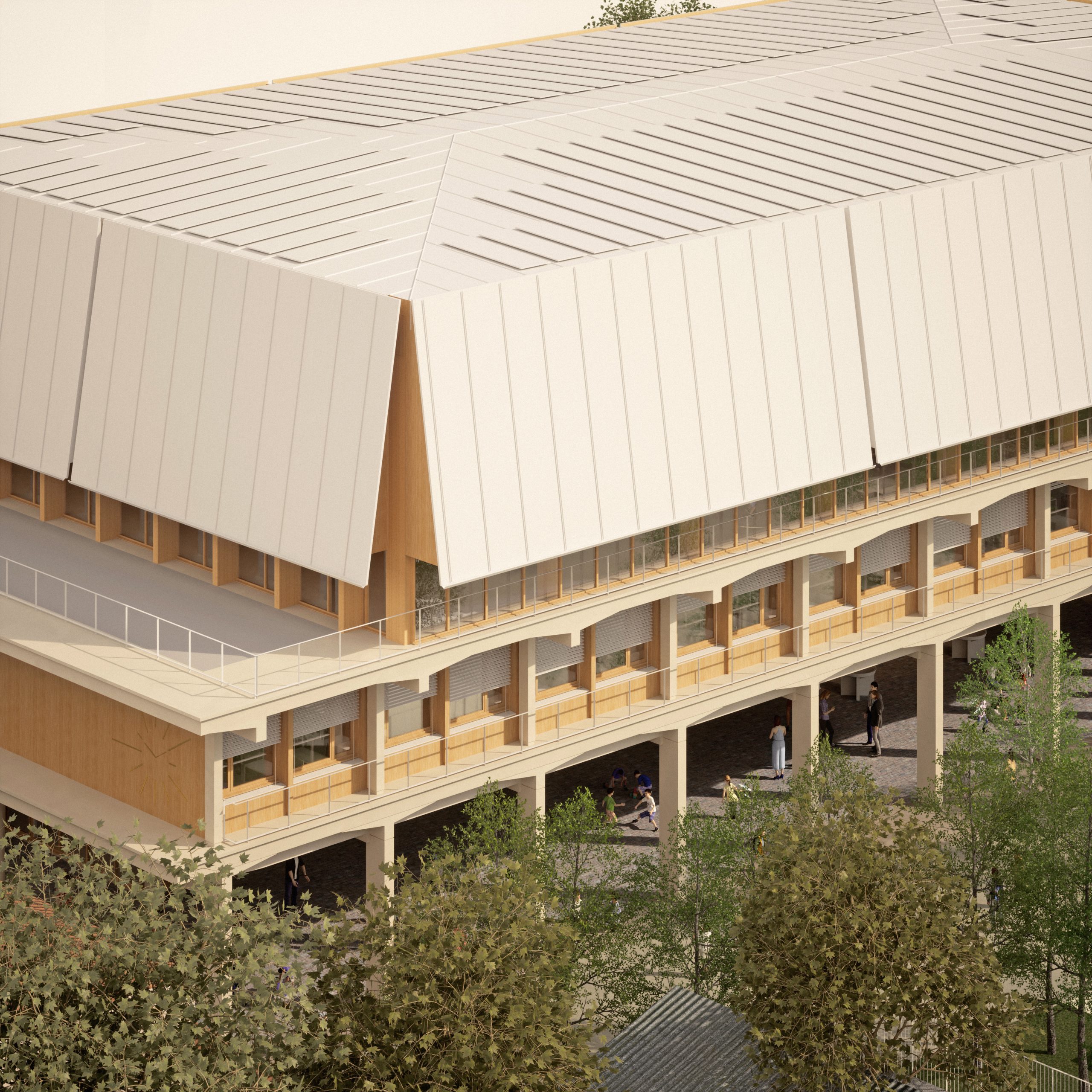 Le collège est installé sur un grand plateau d’enseignement au-dessus d’un RDC qui accueille les espaces collectifs. En toiture, le gymnase est couvert par une large toiture inclinée en Zinc à proximité d’un plateau sportif lui-même sur le toit. Par ces éléments de grandes dimensions, ils manifestent tous les deux la présence du nouvel équipement sportif de quartier.