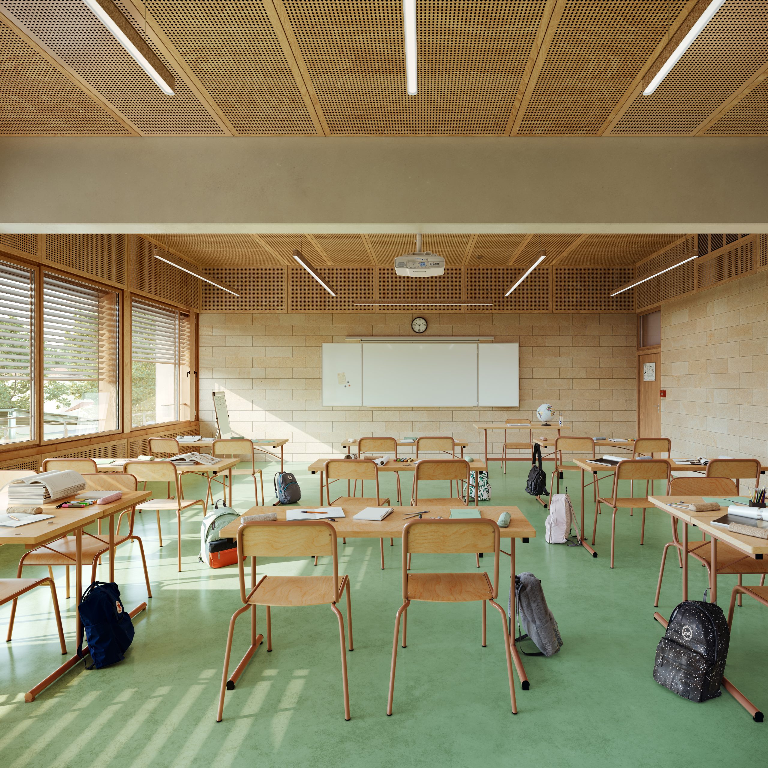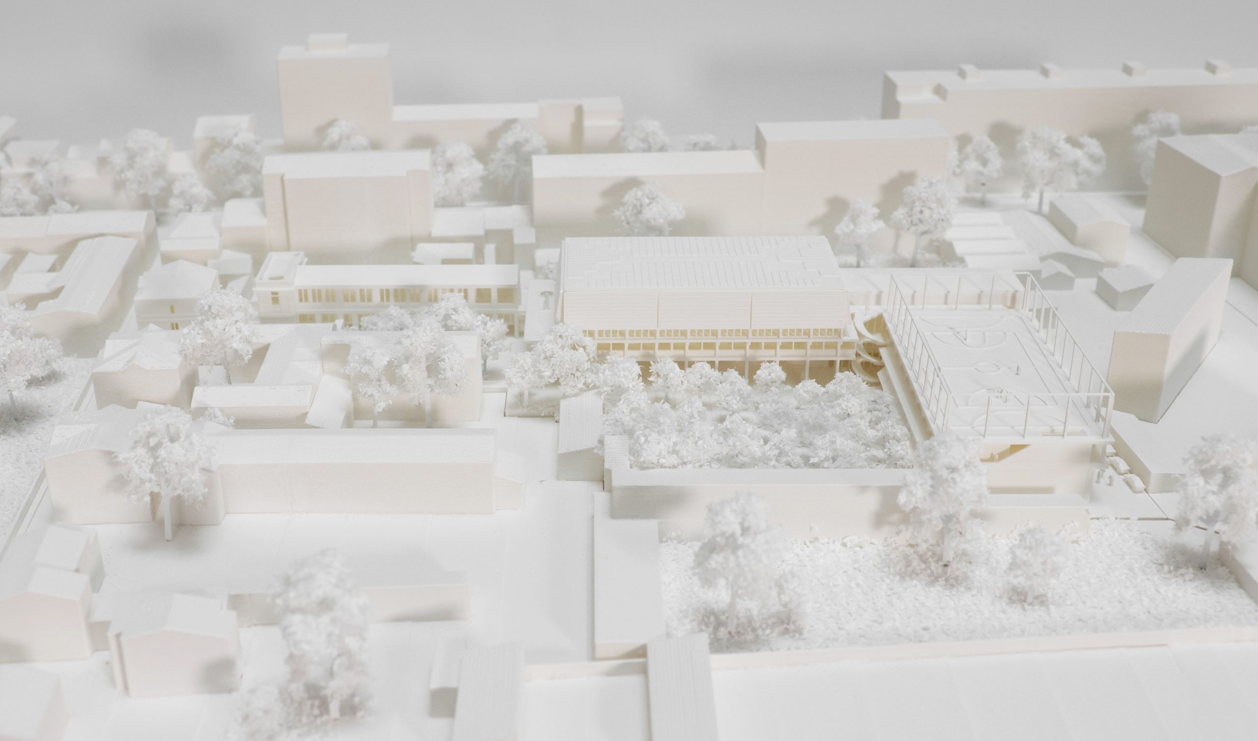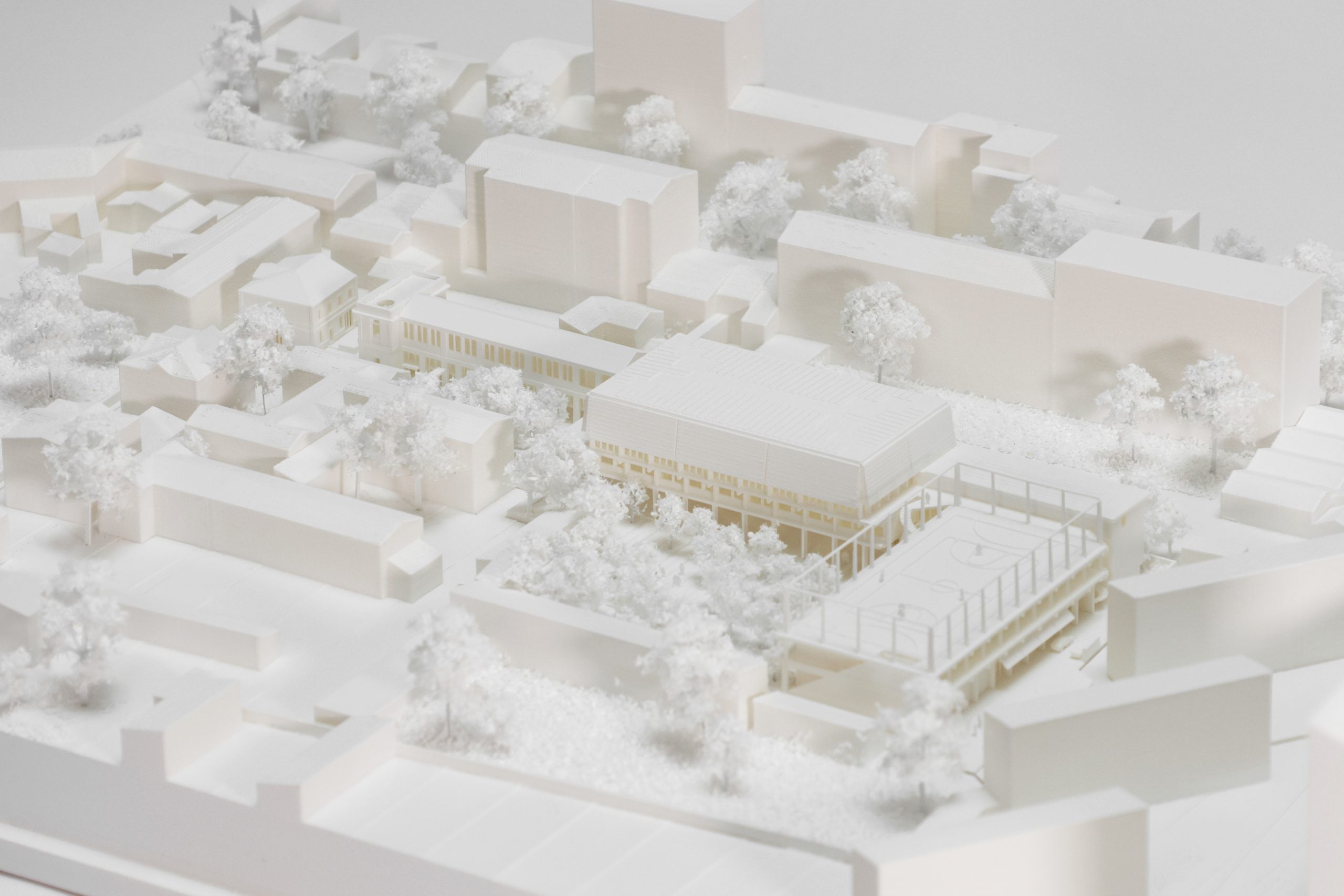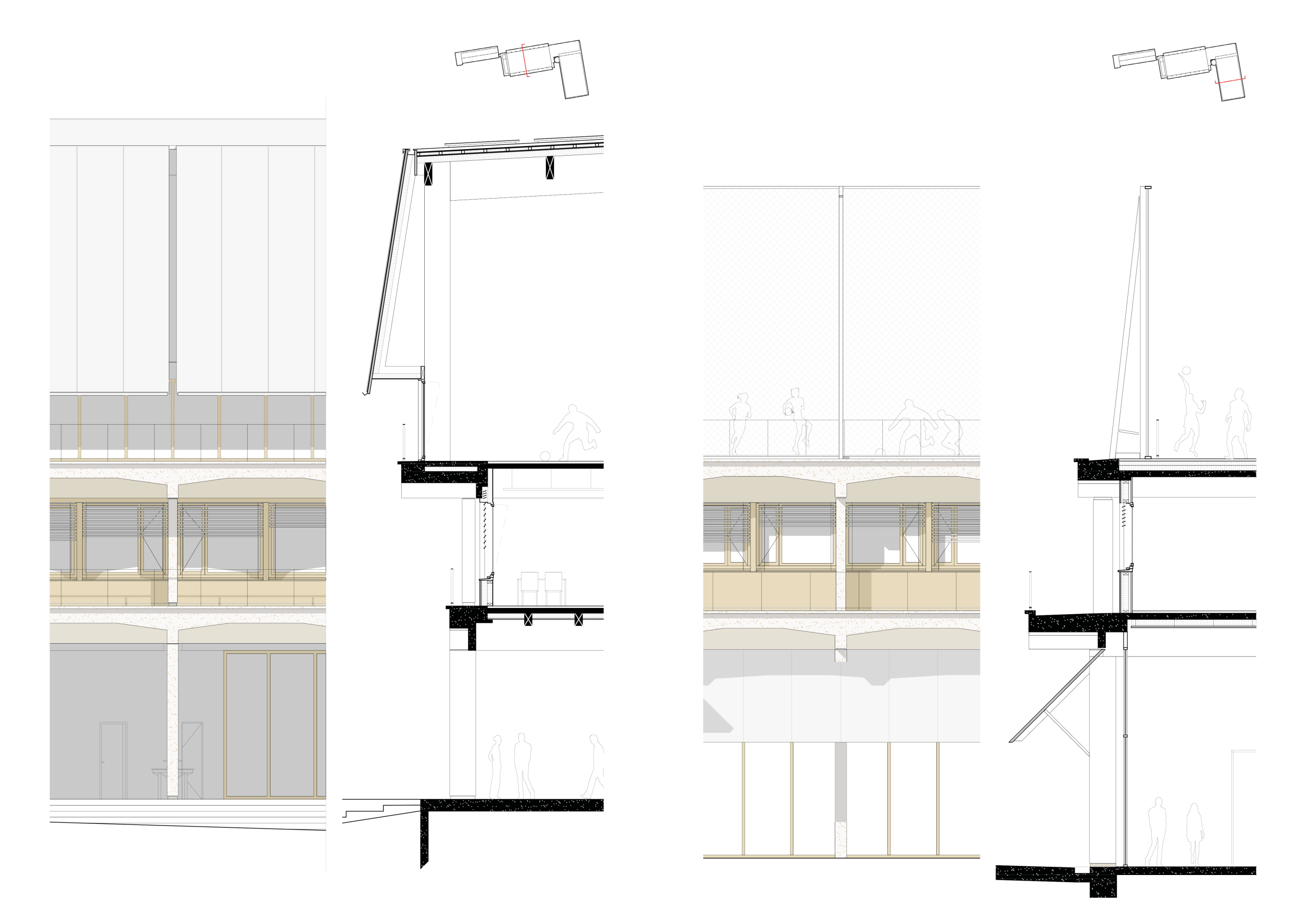 Le collège est installé sur un grand plateau d’enseignement au-dessus d’un RDC qui accueille les espaces collectifs. En toiture, le gymnase est couvert par une large toiture inclinée en Zinc à proximité d’un plateau sportif lui-même sur le toit. Par ces éléments de grandes dimensions, ils manifestent tous les deux la présence du nouvel équipement sportif de quartier.